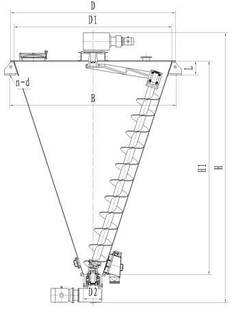 本機主要由錐型筒體、螺旋軸、公轉傳動臂、自轉轉動頭及出料閥組成。物料由上部加入。上部減速機帶動公轉傳動臂使螺旋軸在筒體內作公轉運動。下部減速機帶動螺旋軸作自轉運動,由于兩軸相交成一定角度,中間使用特制的萬向聯軸節傳動。